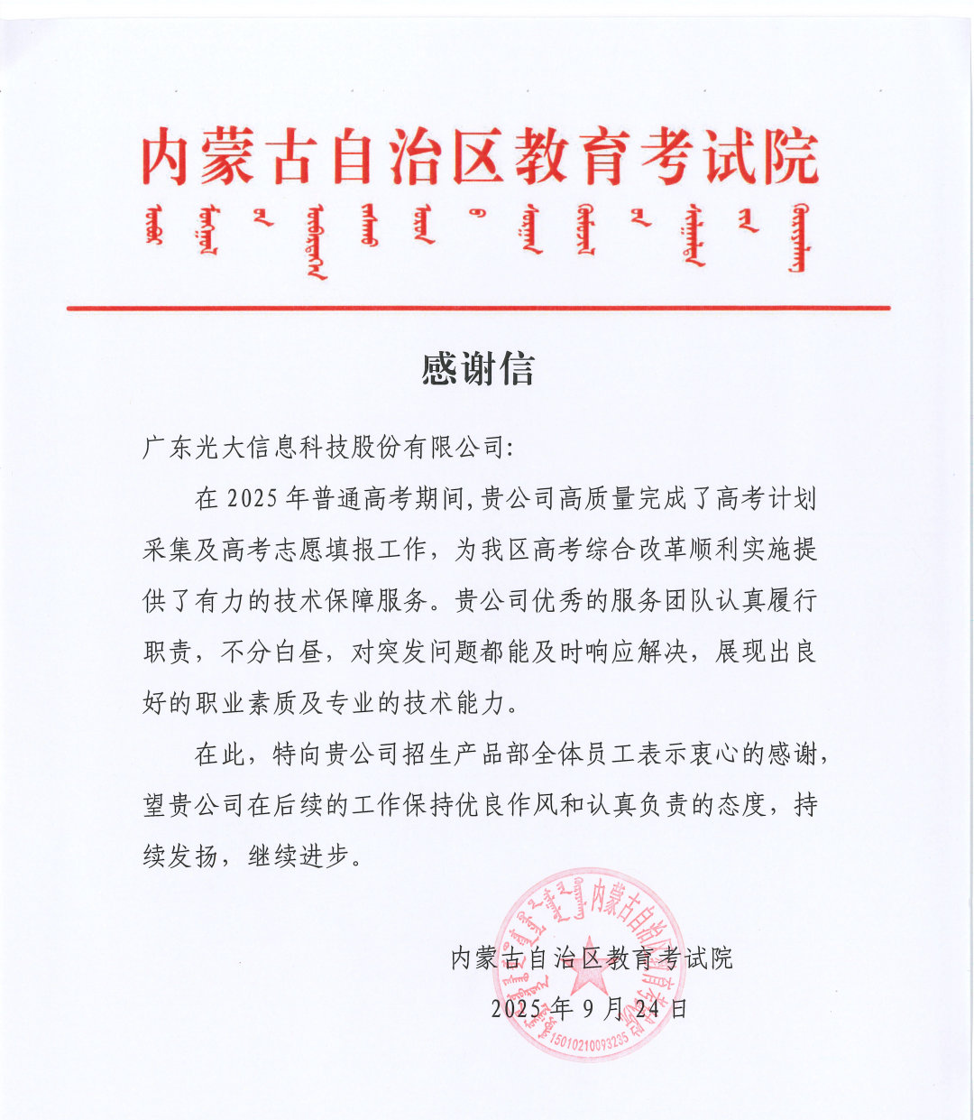 内蒙古考试院在信中对光大的工作表示肯定:“高质量完成高考计划采集及志愿填报工作,为我区高考综合改革顺利实施提供有力技术保障”——这份“硬核认可”,是公司技术研发实力与项目交付能力的有力佐证。